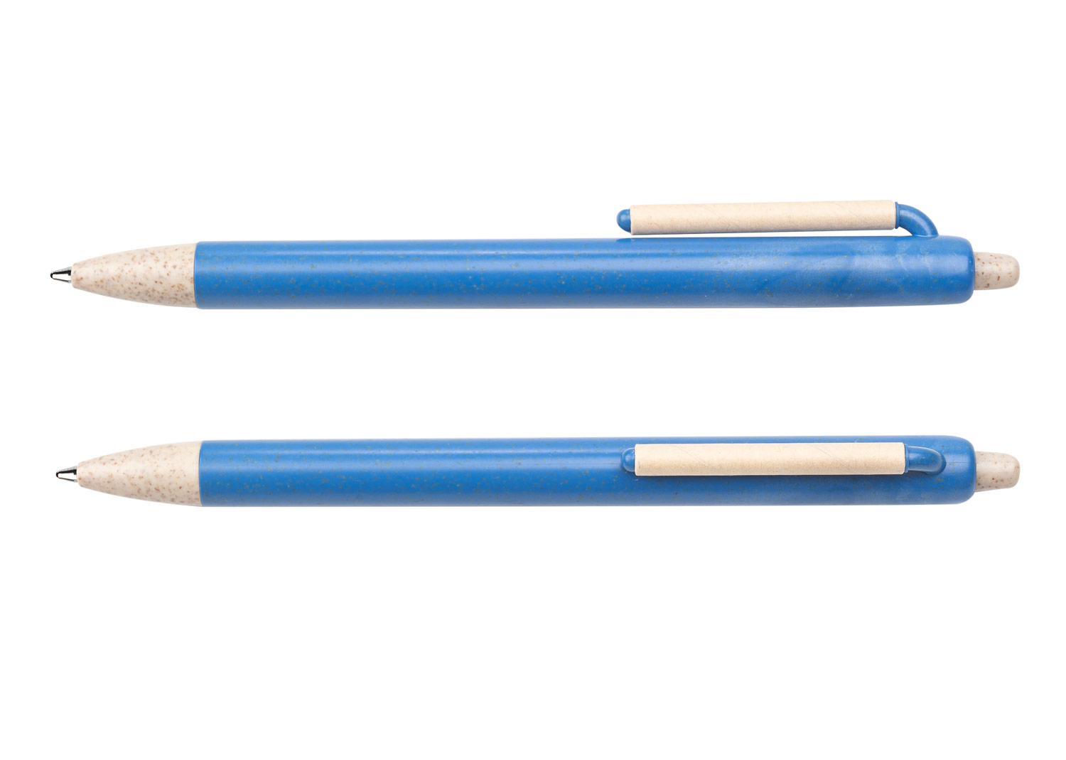 Bolígrafo plástico. Mecanismo push. Mezcla con material ecológico en fibra de trigo (50%-60% aprox). El porcentaje de material ecológico tiene un promedio de biodegradabilidad de 2-3 años después del fin de su vida útil. Medidas:14.4 cm Marca:4 cm/Tampografía Venta mínima y en múltiplos de caja de 50 unidades por color. **Para el material con contenido de fibra de trigo puede haber variación en el tono de los colores debido a la reacción del tipo de material y los colorantes usados en la fabricación** Ficha Técnica