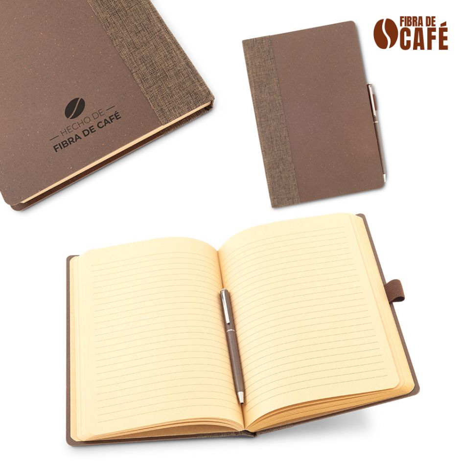 Libreta de 96 hojas (recicladas) con rayas, cubiertas plásticas hechas con 50%fibra de café. Incluye bolígrafo plástico hecho con 50% fibra de café. Mecanismo twist. El porcentaje de material ecológico tiene un promedio de biodegradabilidad de 2-3 años después del fin de su vida útil. Empaque caja individual. Medidas: 15 cm x 21 cm Marca: 6 cm / Tampografía Ficha Técnica