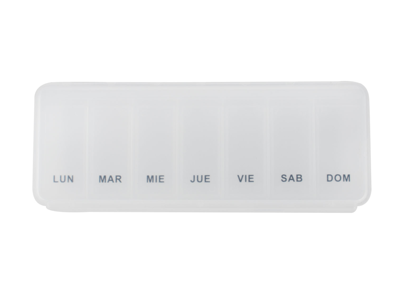 Pastillero semanal con 7 compartimientos asignados para cada día de la semana. Cierre a presión. Color: Morado